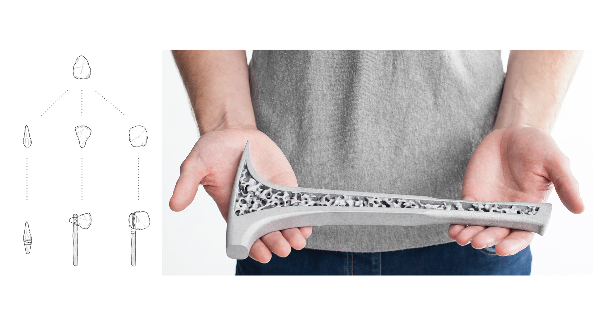 The bachelor thesis deals with the development of humanities tools from the stone age until today. Parallels between natural and technological evolution are explored and the development of humanity through the aid of tools is regarded. Furthermore, nature-inspired generative processes are used to develop an experimental workflow in tool-design.